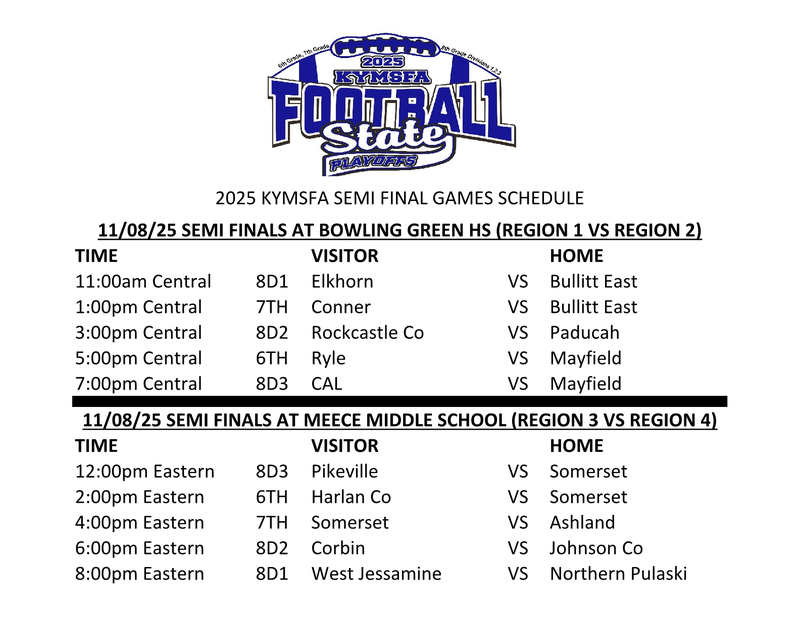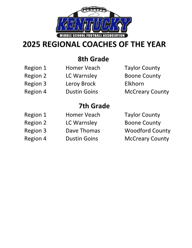 The Kentucky Middle School Football Association is proud to announce its 2025 Region Players of the Year. The winners will be recognized at the State Championship Games on November 15, 2025 at their divisions State Championship Game at Lexington Christian Academy. Players were voted on by coaches.